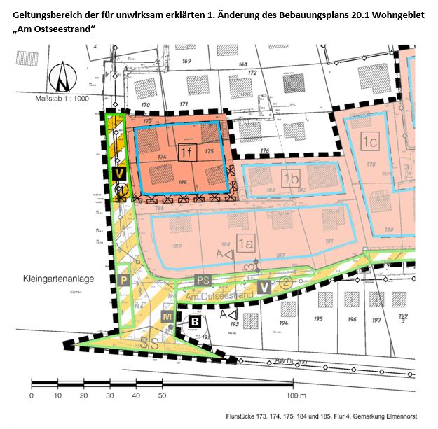 - Die Satzung über die 1. Änderung des Bebauungsplans Nr. 20.1 für das Wohngebiet „Am Ostseestrand“ in Elmenhorst wird für unwirksam erklärt.